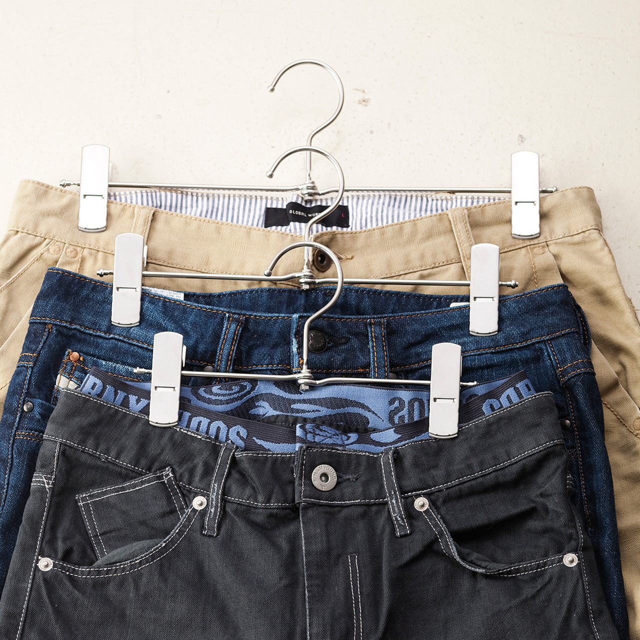 カジュアルからフォーマル、洗濯用まで、あらゆるシーンにも対応できる定番タイプのステンレス製ボトムハンガー。シンプルなフォルムでホテルや店舗用から家庭用としてクローゼットの中まで、あらゆるシーンに対応可能なボトムハンガーです。